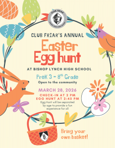 Enjoy an afternoon of fun and friendly competition for kiddos in PK3-8th grade during Club Friar’s annual Easter Egg Hunt on Saturday, March 28, at 2:00 p.m. in Roffino Stadium. Bring your own basket, and celebrate the season with arts and crafts, face painting, a bounce house, live music, and even photos with the Easter Bunny!
