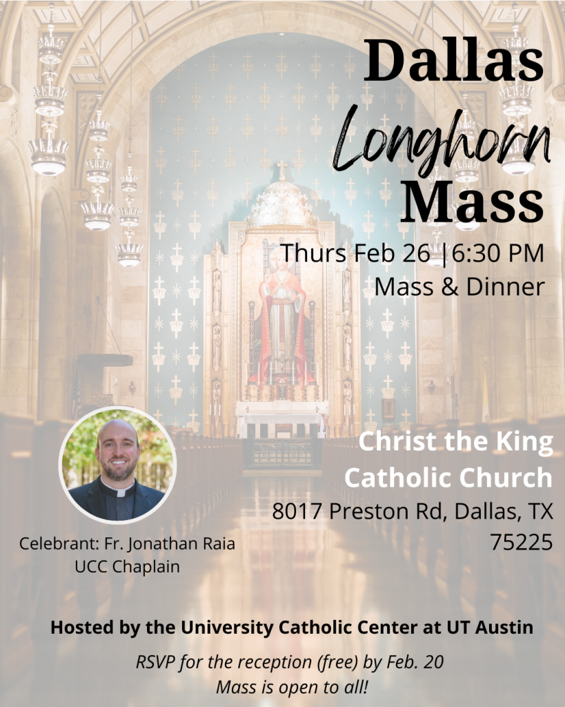 We invite ALL alumni, current students, their families, and fellow Longhorns to join us for Mass, followed by a meal together! This is a wonderful opportunity to reconnect with old friends and meet new ones within our Longhorn community. We look forward to seeing you there!