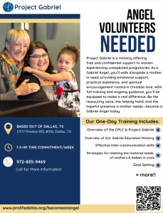 Project Gabriel is a ministry of the Catholic Pro-Life Community. They are in need of volunteers to become Angels. As a Gabriel Angel, volunteers will walk alongside a mother in need, providing emotional support, practical assistance, and spiritual encouragement rooted in Christian love. The training is a one-day event that includes an overview of the CPLC and Project Gabriel, an overview of Our Gabriel Education Ministry, effective inter-communication skills, strategies for meeting the material needs of mothers and babies in crisis, goal setting, and much more. The training will be held at the CPLC office. Volunteers can sign up through the website or use the QR code found in the flyer.
