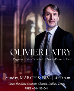 Christ the King Catholic Church proudly welcomes Olivier Latry, Organist of Notre-Dame Cathedral in Paris, for a recital on Sunday, March 8 at 4:00pm as part of the Dottie Thompson Concert Series. Experience electrifying French masterworks and a dazzling improvisation on the magnificent Juget-Sinclair pipe organ by one of the world’s finest organists. Free admission. All are welcome!