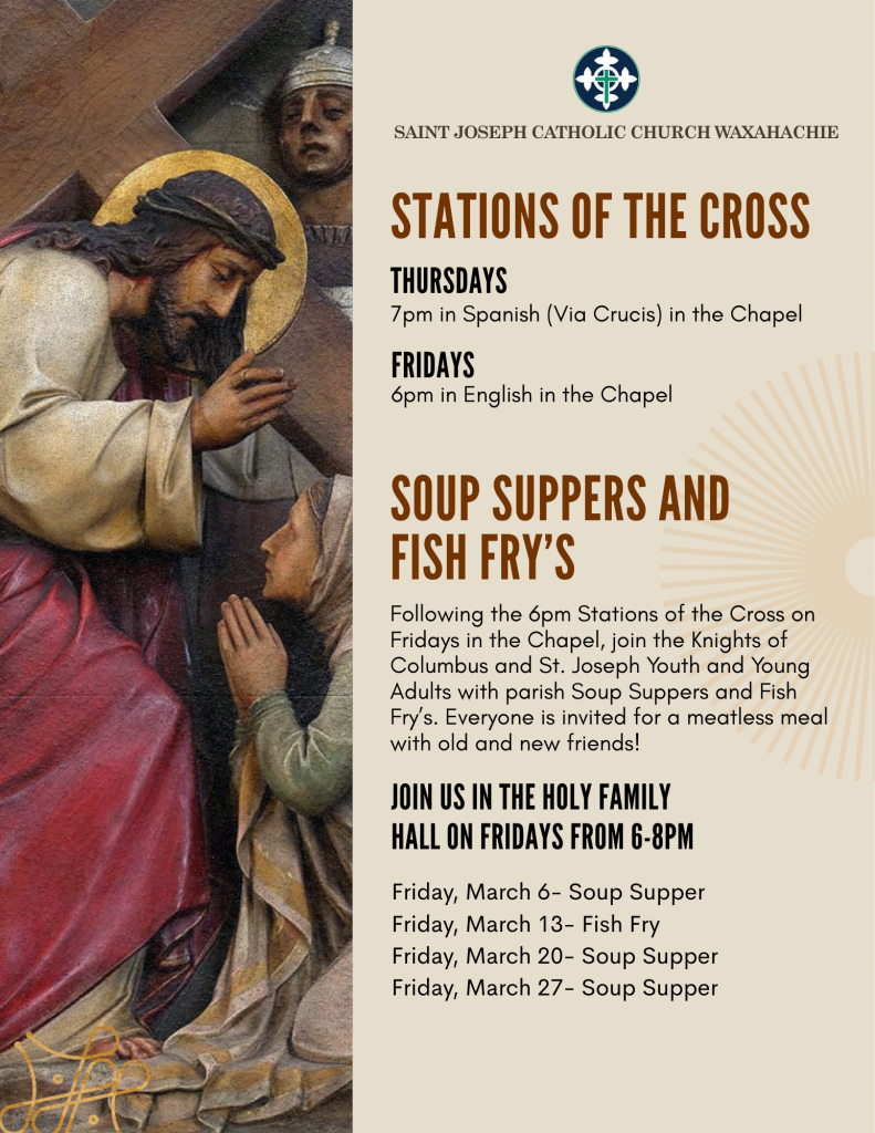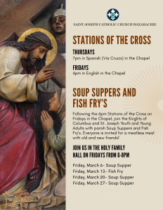 Join us for Stations of the Cross and Fish Fry, eat here or plates available to go.