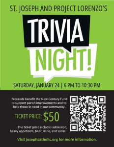 Join St. Joseph Catholic Church and Project Lorenzo for a fun-filled Trivia Night supporting parish improvements and vital community outreach. Tickets are $50 per person and include beer, wine, or soda, along with appetizers.