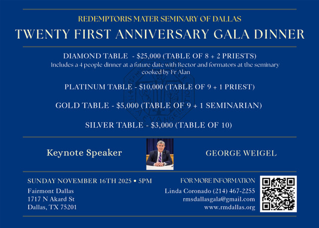 Join us for our 2nd Annual Redemptoris Mater Gala Dinner! We are thrilled to announce that George Weigel, the author...